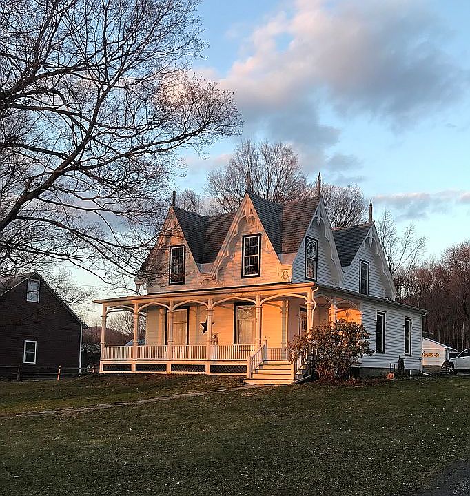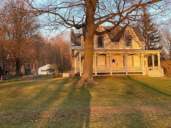 This Gothic Revival home sits on 4.6 acres with a beautiful view of the country side. The home includes a wrap around porch and new windows throughout. The interior has large and spacious rooms with wide plank flooring, high ceilings, and a center stairwell. The 2nd floor includes 4 bedrooms and a newly renovated office space with a separate stairwell. This home includes freshly painted walls, new electrical, a back up generator, a 3 car and 2 car detached garage, and outdoor wood boiler.