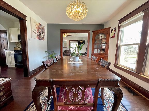 Welcome to this charming 2-story corner lot home! Enjoy a newer roof, gutters, furnace, windows, and new carpet in the living room, stairway, hallway. The main level boasts a cozy living room, kitchen with a charming coffee bar, a dining room showcasing lovely hardwood floors, convenient first floor laundry and a full bathroom. Upstairs, find a spacious master bedroom with walk-in closet, a bedroom with beautiful exposed ceiling beams, a bedroom with new carpet and another full bathroom. An open attic space provides storage or could be a fourth bedroom/game room. Basement has a work bench and provides more storage space. Outside, a newer shed and side deck offer convenience, while a front porch provides a relaxing spot. This home is conveniently located near downtown and the high school.