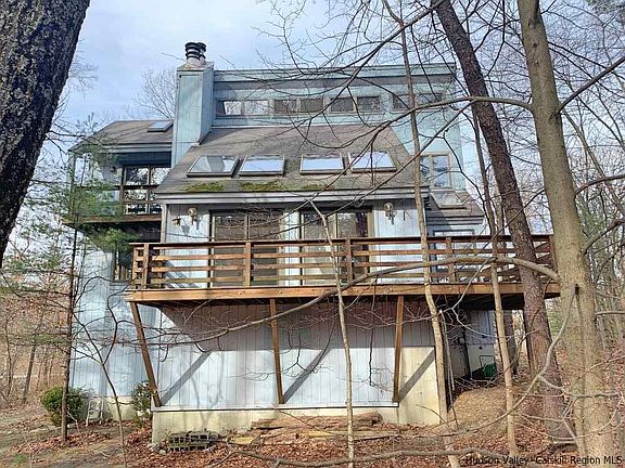 In the woods and by the creek, WildAcre exemplifies how a modern design can fit so well in a country setting. Sitting on an above-grade basement, this custom contemporary home has a higher than usual elevation. Upon entering, you will be greeted with exceptional natural light that lifts your spirit. The spacious living area features soaring ceilings, four skylights, rustic beams, wide-board flooring, and a wood-burning fireplace! It opens to a retro-style kitchen, nostalgia and vintage. It has a center island and eat-in area. Also on this level is a bedroom facing the creek and a three-piece bathroom. Up the stairs, the hallway leading to the upper level bedrooms affords a birds-eye view of the living area, quite dramatic! On this level you will find two more bedrooms and a large full bath. Both bedrooms are bright and airy thanks to the vaulted ceilings and ample windows. Don't miss the Juliette balcony! A wooden deck lines the backside of the living area and the kitchen, where you can enjoy the outdoor living, bird watching, star gazing, morning coffee, or summer evening barbecue... And what about the creek! Launch your kayak or tube right there and let the adventure begin! Prime location just minutes away from Bard College and the village of Red Hook. Come take a look, you may chuckle a little, be surprised a little, and fall in love with this home sweet home!