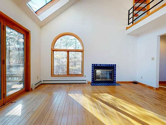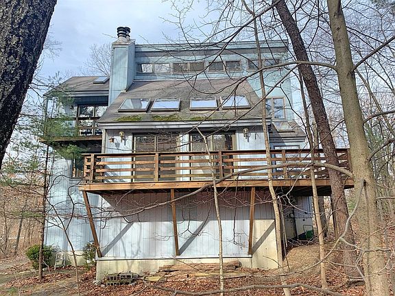 In the woods and by the creek, WildAcre exemplifies how a modern design can fit so well in a country setting. Sitting on an above-grade basement, this handsome custom contemporary home has a higher than usual elevation. Upon entering, you will be greeted with exceptional natural light that lifts your spirit. The spacious living area features soaring ceilings, four skylights, rustic beams, wide-board flooring, and a wood-burning fireplace! It opens to a retro-style kitchen, nostalgic and vintage. It has a center island and eat-in area. Also on this level is a bedroom facing the creek and a three-piece bathroom. Up the stairs, the hallway leading to the upper level bedrooms affords a birds-eye view of the living area, quite dramatic! On this level you will find two more bedrooms and a large full bath. Both bedrooms are bright and airy thanks to the vaulted ceilings and ample windows. Don't miss the Juliette balcony! A wooden deck lines the backside of the living area and the kitchen, where you can enjoy the outdoor living, bird watching, star gazing, morning coffee, or summer evening barbecue... And what about the creek! Launch your kayak or tube right there and let the adventure begin! Prime location just minutes away from Bard College and the village of Red Hook. Come take a look, you may chuckle a little, be surprised a little, and fall in love with this home sweet home!