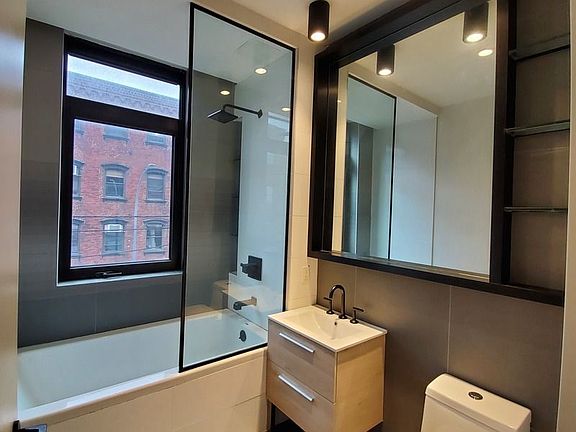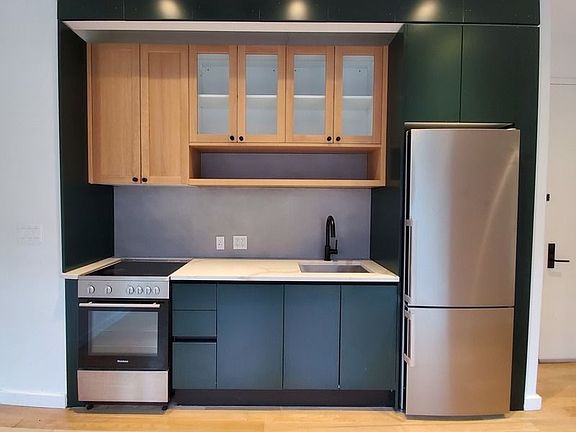 Prime Greenpoint 1 bed/1bath Large, wrap around windows in the living room Medium sized room will fit a queen sized bed and dresser or desk Closet in bedroom and coat closet in entrance Dishwasher, microwave, electric stove, remote controlled AC/Heater, built in bluetooth speakers Furnished rooftop, pet friendly, gym, coworking space, garage parking, laundry room 2nd floor features a shared large terrace