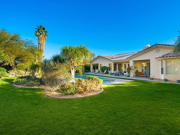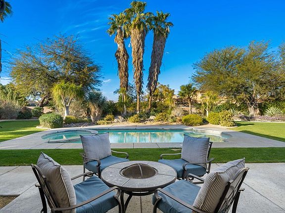 An exquisite, one-of-a-kind desert home; this stunning plan defines luxury desert living with numerous upgrades throughout. With no detail overlooked, the home has been expertly designed and lovingly maintained. Welcoming and spacious rooms create an open plan perfect for entertaining. The interior wonderfully brings the outside in without taking away from the grand and dramatic architectural details within. Tastefully appointed and highly sophisticated from the pristine tile floors, to clean and intersecting architectural lines and soaring ceilings. A chef's dream comes true in the gourmet kitchen with spacious surroundings, warm-finished banks of cabinetry, granite countertops, and top-of-the-line appliances. Luxuriate in the master suite with spa-style bath, dual vanities and generously sized walk-in. Guest rooms and private office are also spacious and beautifully appointed. The desert lifestyle come alive out on the entertainment patio where al fresco dining and entertaining are perfectly accommodated. Enjoy dips in the sparkling pool and spa as you marvel at the fairway green and unobstructed views beyond. Decidedly, a one-of-a-kind desert dream home!! Furnished per inventory