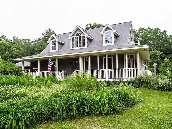 OVERSIZED COUNTRY CAPE WITH WRAP AROUND PORCH, FIRST FLOOR MASTER BEDROOM WITH FULL BATH, SOAKING TUB AND STALL SHOWER. 2 STORY LIVING ROOM FEATURES A FIREPLACE, BUILT IN CABINETS AND FRENCH DOORS TO LARGE DECK. LARGE EAT IN KITCHEN WITH MAPLE CABINETS. DINING ROOM HAS A BOW WINDOW. WOOD FLOORS. UPPER LEVEL OFFERS 2 BEDROOMS WITH LARGE CLOSETS AND A BATH. INTERIOR, FRONT PORCH AND THE DECK WERE ALL JUST PAINTED. ATTACHED 2 CAR GARAGE AND A SMALL BARN/SHED. HOME IS ON 4.6+ PRIVATE ACRES WITH MATURE GARDENS.