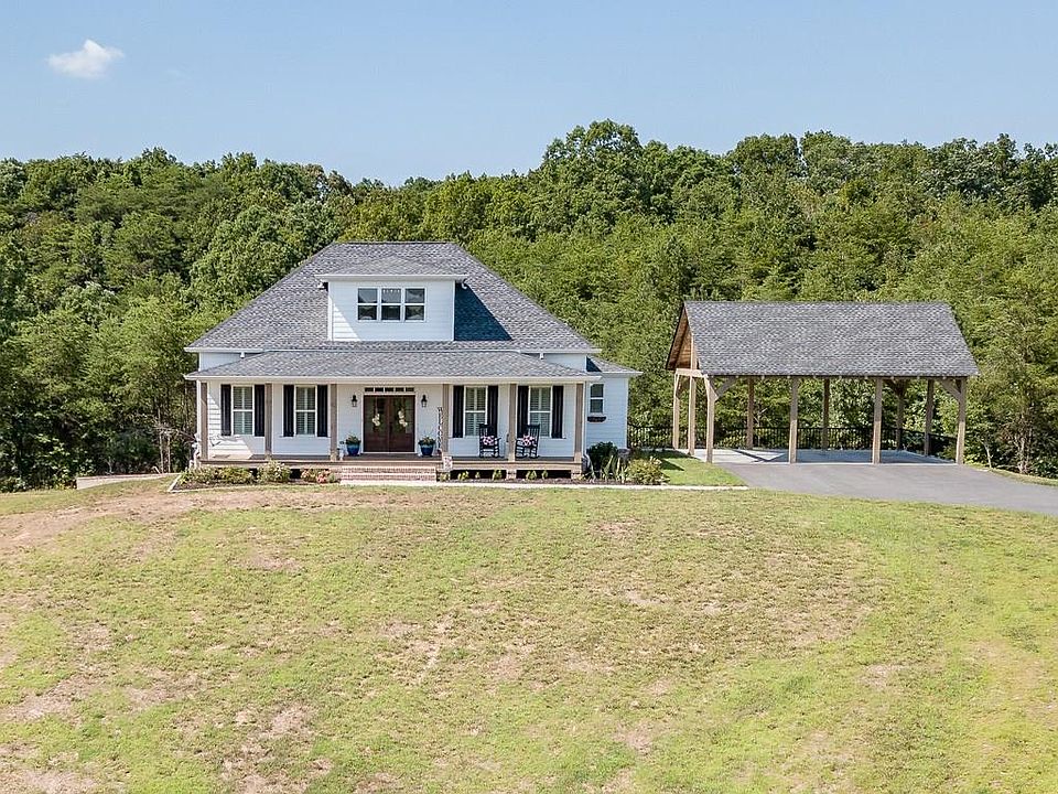 Do you dream of country living but with modern luxuries? This beautiful, custom farmhouse on 12.4 acres won't disappoint! The attention to detail, shiplap, gorgeous hickory hardwoods & high ceilings make this a true country charmer. Built in 2016 so all appliances & systems are in excellent working condition. Master plus one other bedroom on main. Open floor plan with views to the living & dining room from kitchen. Custom white, soft-close cabinetry. Full, unfinished basement that has been stubbed & roughed, & storm shelter. Very private residence w/ beautiful views.