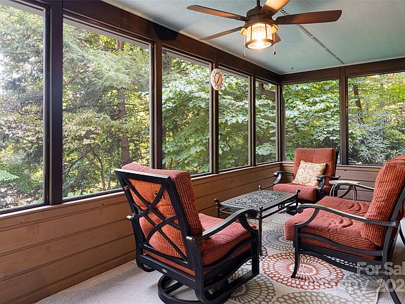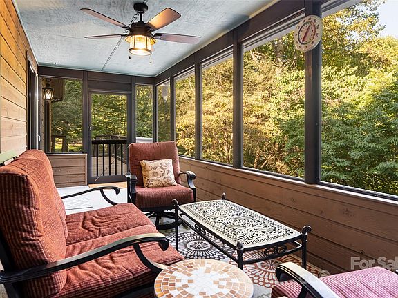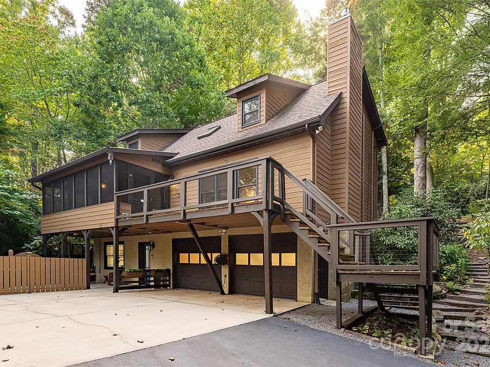 Mountain retreat nestled on a full acre, just minutes from Asheville and steps to the Blue Ridge Parkway. Mature trees and walking trails make this property an outdoor enthusiasts’ delight. Plenty of space to relax and entertain with a lower front patio and porch swing, screened-in porch adjoining a spacious deck, back patio outdoor dining area with retractable awning, and fire pit sitting area. Natural light brightens the interior, and the gas fireplace offers a cozy ambiance. Featuring a remodeled kitchen and main-level primary suite with a luxuriously updated bathroom. Upstairs you will find two more bedrooms, a dedicated office space with a sliding barn door, and a full bathroom. The basement offers a versatile living space with a 4th bedroom/flex space, living area, full bathroom, and a separate entrance- ideal for guests, extended family, or a rental space. A beautifully landscaped terraced yard, potting shed, and fully fenced area are ideal for gardeners and pet enthusiasts.
