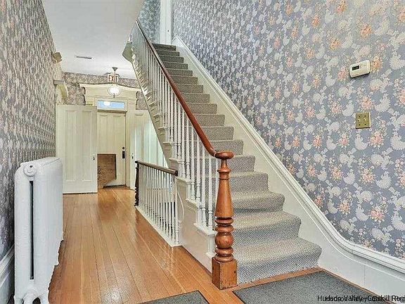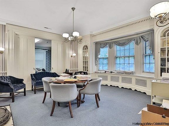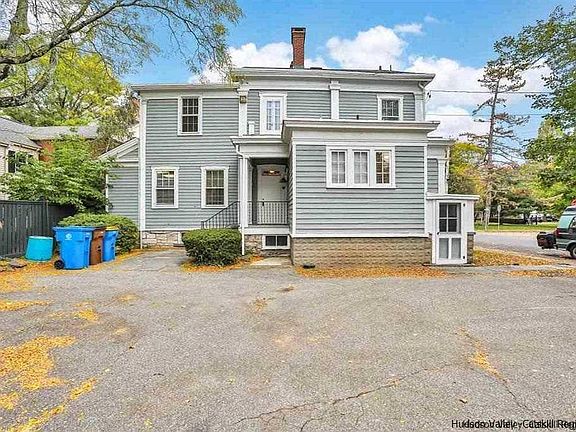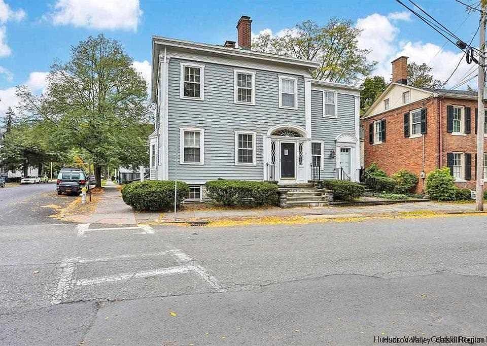Charming Uptown Kingston home was built around 1880 and retains most of its original finishes and charm. Located on a corner lot, the regally sited home overlooks Academy Green park and is just a few minute walk to all restaurants, stores and shops. Step inside to all soaring 9 foot ceilings on the first floor, bold wide trim, step crown molding and lots of built-ins. Large open rooms are enhanced with pocket doors, fireplaces and lots of natural light. There is all hard wood flooring under most of the carpeting and a full (proposed) kitchen layout in associated doc's. The home is currently used as office space and can be used as it is, also a single family home or a live work building. The second floor has 4 bedrooms, one being a master suite with a wood burning fireplace and tiled full bath. The other 3 bedrooms have hard wood under the carpeting and are serviced by another full bath in the hall. The third floor is a walk up attic, great for storage or could offer future finishing possibilities (with proper City permitting). The lower level of the home has its own private entrance and then also access from inside, its about 50% above grade, interior and exterior access would allow for possible additional rental income, two rooms are finished each with its own fireplace, one with original charming brick oven fireplace, large windows and plenty of storage. The parking lot offers 8 spots (1handicap). There is also plenty of street parking with no meters.