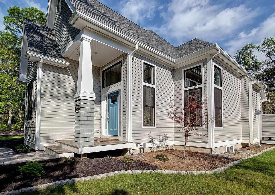 Gorgeous New Home in quiet upscale neighborhood. Open concept with 12 foot ceilings, ship lap, stone and heart pine fireplace. Kitchen has 10' Quartz island with seating, professional appliances and double cabinets. Dining Room with built ins and beverage refrigerator. First floor master suite with tray ceilings, barn door, huge walk in custom closet. Master bath with soaking tub, 6' double shower and double vanity. First floor office and laundry room. Laundry has sink and quartz counter top. Two large Bed Rooms and bath on second floor. Enter the outdoor oasis through triple slider to deck that has annex deck for optional outdoor kitchen or outdoor shower. Step down onto your patio with pergola into the large private yard that abuts conservation land.Close to town, beaches, walking trails and all Falmouth and Cape Cod have to offer. Enjoy it all in your new luxury home.Ammenties List State of the art home designed for luxury with minimal maintenance. High end finishes including custom moldings, huge windows, 3 panel solid doors. Hardwood floors and tile Kitchen with 10 foot quartz island, professional appliances, high end cabinets. Dining Room with glass front built ins and beverage refrigerator. First floor Master suite with huge walk in closet with custom closet by Boston Closets and tray ceiling with chandelier Master bath with ship lap, soaking tub and 6 foot double shower and double vanity and has humidity sensing exhaust fan. 12 foot soaring ceilings First floor master bedroom and first floor office Up scale light fixtures with high efficiency LED lighting.Outdoor space includes, mahogany deck that leads to patio with pergola. Annex side deck that allows for optional outdoor shower or kitchen. Lawn irrigation Large Basement windows to allow for future expansion HERS rated house (Home Energy Rating System) High Efficiency Heating System with Nest WiFi Thermostat allowing complete remote control. Central Air Conditioning
