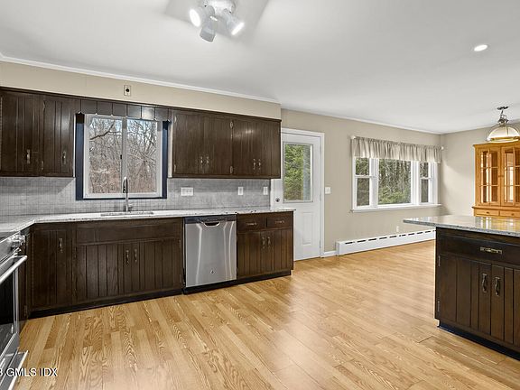 Quiet yet convenient location features a four bedroom Ranch with deck and great backyard on .31 acre bordering conservation land in desirable Glenville neighborhood close to shopping, schools, Pemberwick Park, beach and trains. Main floor boasts a light-filled open floor plan living room with large windows, spacious granite-clad kitchen with counter seating, deck access and comfortable dining or breakfast room all with hardwood floors. Go up a few stairs to the primary bedroom with lovely backyard views, two bedrooms and full hall bath. Lower level offers a roomy fourth bedroom suite with dressing area and full bath, ideal for an au-pair/in-law or as a possible office as well as a walk-out unfinished area with work-bench, laundry and storage. With attached one-car garage.