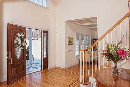 East Mountain preserve is surrounded by natures beauty with hiking and walking trails. Anchored by stone walls, a quiescent drive invites you to this specially designed home offering complete privacy. The light pours into large open rooms that flow beautifully for entertaining. Built in 2005, the elegance of this home is defined by the rich inlays in the wood floors, coffered ceilings in the living and dining rooms, classic columns,and medallions in the trim work add personality and richness. The stylish kitchen is equipped with granite & ss