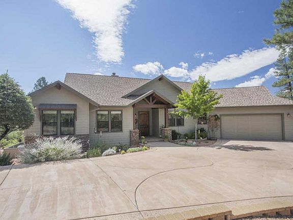 Exquisite single-level 3 bedrooms + office, craftsman style home near the National Forest! The location of this home, tucked away amongst majestic Ponderosa Pines near the national forest, on almost an acre lot, is the ideal location. Upon entry to the home you are greeted by a warm Great Room with a wall of windows bringing the outdoors in with lots of beautiful light, a stone fireplace, hardwood floors, built-in cabinetry and shelves and a rustic wood beamed ceiling. Outside there is an expansive covered deck with views to the Granite Dells and perfect to enjoy the cool mountain evenings and watch elk graze below. The kitchen, the perfect centerpiece to entertain with a large island and nearby dining area, features stainless steel appliances, custom cabinetry, custom cabinetry, a large island and expansive pantry. The very large laundry room offers a built-in hobby area which makes a perfect space for sewing or scrapbooking. The cozy office/den (or 4th bedroom) has double doors and plenty of storage space. The Master Suite, nicely separated from the two guest bedrooms, has en suite bath with dual vanities, separate soaking tub and snail shower. The fenced yard area features no maintenance synthetic turf lawn, including a private two-hole putting green, a child's play area, a workshop with electricity, a greenhouse with water/electricity and an additional garden area. This spectacular home is not one to miss, come see it now!