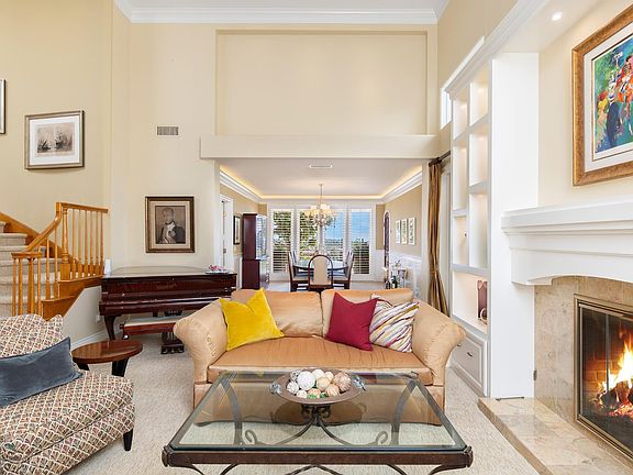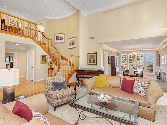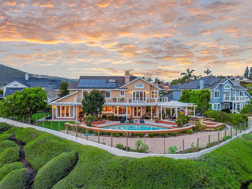 An entertainer's dream awaits in this stunning residence in the guard-gated community of Crest de Ville. Sited on one of the largest lots in the community, measuring approximately 13,986 square feet, 44 New Haven offers unobstructed 180-degree sit-down views, elegant interiors, and unmatched privacy. Meticulously maintained and fully updated throughout, this light-filled home includes four bedrooms, four bathrooms, and two additional multipurpose spaces. The ground level features a dedicated entry, a double-height formal sitting room with a fireplace, and an adjacent dining area with a temperature-controlled wine cellar. The kitchen, which opens to the living section, abounds in highlights such as updated appliances, granite countertops, a travertine backsplash, and a breakfast nook. Accessed through French doors, the breathtaking backyard boasts a custom pool and spa, an outdoor kitchen, and a covered sitting area ideal for year-round enjoyment. A coveted main-level private ensuite bedroom and a home office that could serve as sleeping quarters complete this floor. A fireplace anchors the upstairs primary suite with a large balcony for taking in spectacular ocean views, a spa-like bathroom with travertine flooring, a walk-in closet, and a connected multipurpose room. Secondary bedrooms on this level share an updated full bathroom with dual sinks. A spacious, airy bonus room with abundant built-in cabinetry rounds out the upper level. Extensive upgrades include solar panels, a security system, a central vacuum, updated air conditioning, and plumbing. In addition to around-the-clock security, Crest de Ville amenities comprise a pool, spa, playground, and sports court. The central location allows for access to renowned resorts, world-famous beaches, and convenient shopping in mere minutes.
