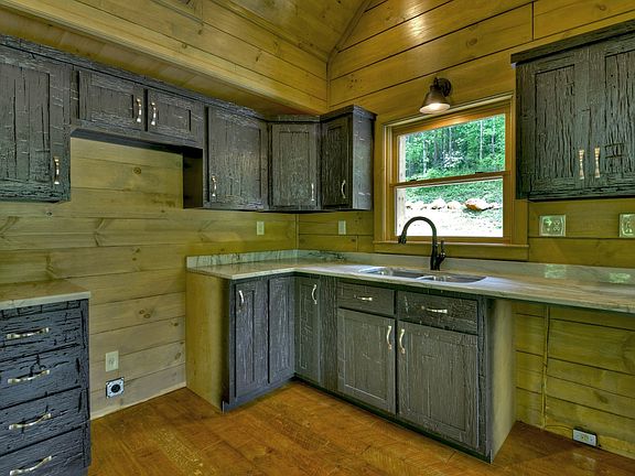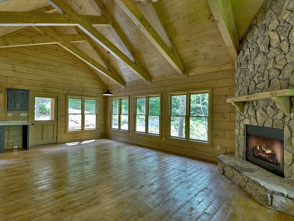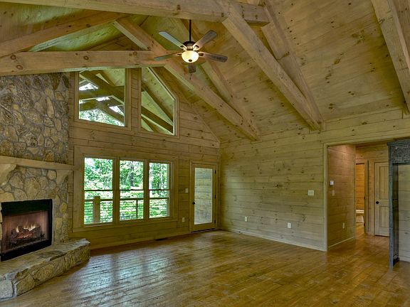 Indulge in the tranquility of this extraordinary timber frame and log cabin, offering an escape from the bustling world, yet conveniently located between Blue Ridge and Ellijay. Nestled amidst nature's wonders, this luxurious retreat beckons you with its seamless integration of rustic charm and modern touches. The cabin itself is a masterpiece of architectural craftsmanship, boasting a soaring Great room with timber frame beams and floor to ceiling rock FP. This grand space flows into a spacious dining area and a well-appointed kitchen, creating an inviting ambiance for entertaining. Immerse yourself in the timeless beauty of this haven, adorned with wood floors that exude warmth and character throughout. The attention to detail is evident in every corner. Unwind on the beamed, covered porch.