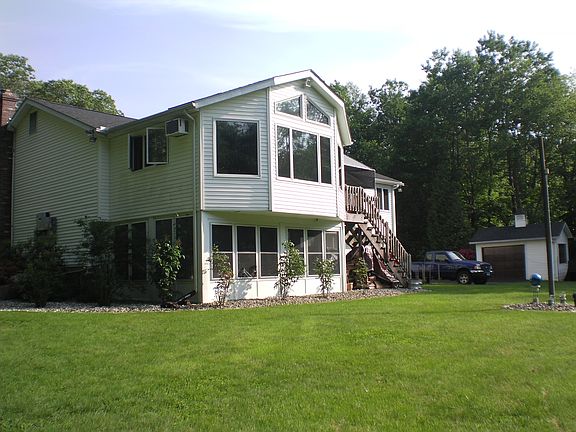 This is not your average Raised Ranch! What makes this home truly special is the beautiful lot on which it sits and the two-story addition in the rear. Upstairs there is a delightful open floor plan that is perfect for family time and entertaining. The upper addition provides a large, full-season sun-room with cathedral ceilings and a terrific view of the spacious backyard. The 3 bedrooms are all well-sized the master has it's own full bath. Downstairs is a large area with a full-bar and a wood-burning stove. The lower addition provides a sauna and work-out room. The home is in excellent mechanical and structural condition. The leased solar panels are highly-efficient and will save you considerable $ on your electric bills. New septic tank and distribution box being installed now. Call today to schedule your own private showing!