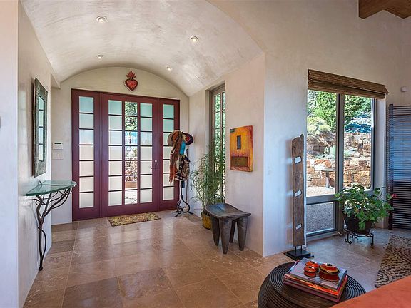 VIEWS VIEWS AND MORE VIEWS! Truly exceptional contemporary pueblo style home privately located in the Tesuque Valley with spectacular badland views. Wonderful open floor plan includes a great room with generous living room area, dining area and open kitchen, all with dreamy views. Travertine floors throughout add to the serene feeling that is palpable. High beamed ceilings emphasize the generous proportions of the rooms while well placed skylights enhance the natural lighting. The kitchen has granite and frosted glass counters, all the stainless steel appliances one could want including a wine refrigerator. The master shares the same mountain views and includes a wonderful master bath. Two or three additional bedrooms, all of generous proportion and each with private baths. The second bedroom has a custom entertainment center including a desk area. There are several patios, the largest being on the view side of the house. There are three fireplaces, hard-trowel plaster walls, two evaporative cooling units and a two car garage with direct entry to the kitchen area. Best of all there are no steps within the house - all on one level.
