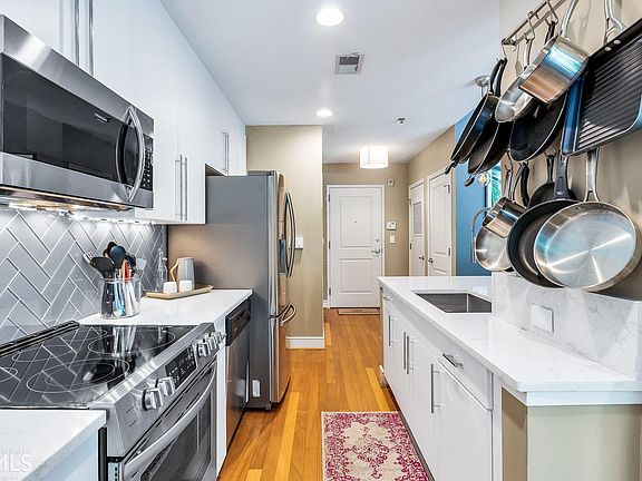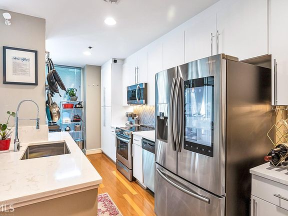 Exceptional (& largest) 1 bed, 1.5 bath w/stunning kitchen reno. Quartz countertops, re-designed island + pantry, tile backsplash - incl. Philips smart lights & refaced/easy clean cabinets. Chef's sink & fixtures + new stove/cooktop, disposal, microwave & smart fridge w/touch screen. Spacious open layout feats. hardwoods, add'l 1/2 bath, custom lighting & drapes, six wifi-enabled switches. Floor-to-ceiling windows to expansive private terrace optimal for entertaining or lounging. Impeccable views of city skyline, gardens & resort-style amenities (pool, grills, fire pit). 24-hr concierge, deeded garage parking. Recent refresh of fitness center (incl. Peloton), lobbies, community room & halls. Elevator to Publix. New Whole Foods, NCR, CODA & GA Tech nearby.