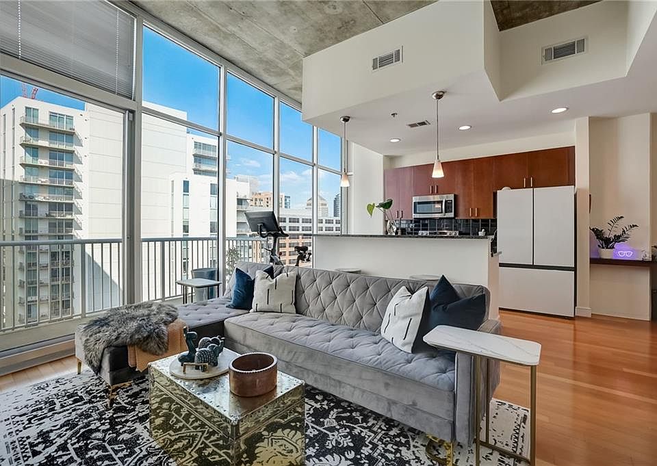 Rare opportunity! Penthouse condo in the heart of Midtown! The condo welcomes you with an open concept, gleaming hardwoods and 12' floor to ceiling windows. The updated kitchen is a chef's dream with wood stained cabinets, stainless steel appliances, tiled backsplash, elegant stone countertops and a beautiful view of the family room. The family room offers access to the balcony to take in those gorgeous Atlanta views! The Primary Suite boasts tray ceilings, a large walk-in closet, a tub/shower combo bathroom with a large vanity with ample storage space. The Plaza Midtown offers resort-like amenities, including 24-hour concierge, a saltwater pool, state of the art fitness center, clubroom, grills, entertaining decks, a fire pit, and an elevator that goes directly to the Publix located below. There is even a pet relief station in the building! Conveniently located to all that Midtown has to offer, including Piedmont Park, restaurants, shopping, and nightlife. Parking is made easy with an assigned private parking space in the gated garage. The building is FHA and VA approved. Schedule your appointment to view this beautiful Midtown condo today!