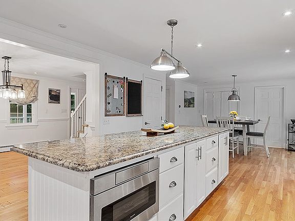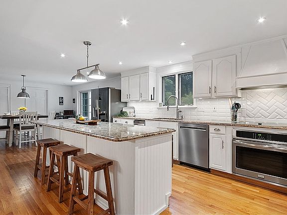 Welcome Home! Located at the end of a Cul-De-Sac sits this colonial style home with an inviting front porch, mature landscaping and paver brick driveway. Step through the front door to find the perfect space for a home office or study on your left, and to the right a formal dining area with custom built-ins and ornate hardwood floors. The hallway opens to an expansive eat in kitchen, with an oversized island that offers additional seating. Newer appliances, separate pantry, sliding doors to the back deck and a 1/2 bath/laundry room combo. Through the kitchen you enter a great room with wood stove, cathedral ceilings and a bright sunroom room that has its own sliding door entrance to the back decks overlooking an inground pool, garden area and pool house/storage shed. Moving upstairs you will find a primary bedroom with a walk-in closet and en-suite 3/4 bath. A two additional generously sized bedrooms, Full Bathroom, HUGE linen closet, PLUS a 4th room with a surprise stairway to the third floor BONUS room. Perfect space for a 4th bedroom, craft or game room. You will also find two additional walk-in storage areas on the third level. The basement offers a two-car garage, utility room, work room, mud room and an additional bonus space that could be used for a media or exercise room. This property dazzles the eye at your every turn, inside and out! QUICK CLOSE welcomed.