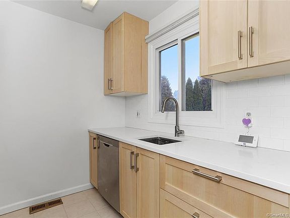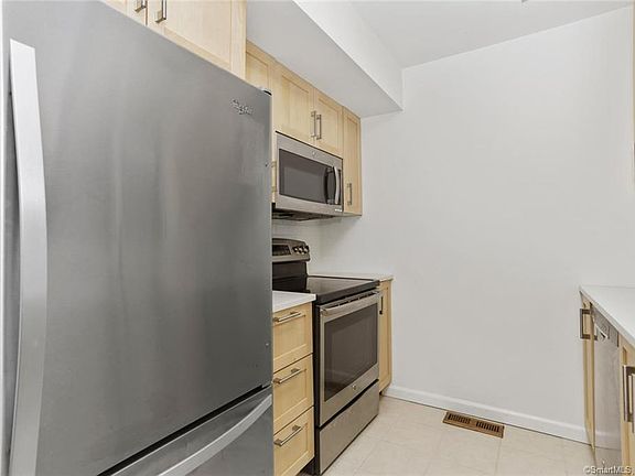 Sun-filled end unit townhouse tucked away on a quiet cul-de-sac walking distance to downtown Stamford. Welcome to this spacious 2 bed, 1.5 bath with a 2 car attached garage! Renovated kitchen with quartz counters, subway tile backsplash and stainless steel appliances. Natural light floods into the open concept living and dining area with gleaming hardwood floors. Step outside and relax on the private balcony right off the living area. Upstairs you will find 2 spacious bedrooms with custom closets. A full bath and laundry are also located on the upper level. Plenty of closet space throughout and additional storage in the large 2 car garage. Forest Square is a beautiful, well maintained complex with reasonable HOA fees. Just unpack and move right in to this oasis in the city!
