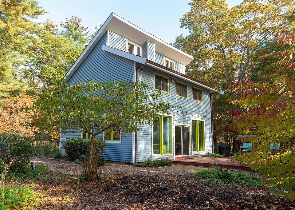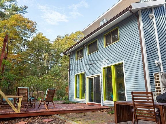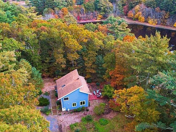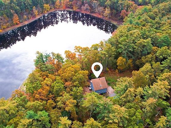 Come see this unique open floorplan contemporary 3 bed 1.5 bath home setback from road on 5+ acres of wooded land abutting Clear Bottom Pond. The sunlit main level features wrap around floor to ceiling windows & brick floors. The property provides great privacy perfect as a year round home or getaway family/compound one hour from Boston. This "Casa" has a latin design flare with its bold color themed kitchen & tiled baths. Some of many recent updates include new water well, plumbing, kitchen appliances & waterfront dock in 2022, vinyl siding, mini split A/C/Heat system & oil tank in 2023. 2nd level has 3 beds, full bath with skylight & a laundry room, 3rd level reveals an addition bonus room/children's playroom. Plenty of parking plus 2 storage building/sheds on the property. Home can be delivered either furnished or empty. Oil fired boiler with direct hot H2O heater & new mini split system heat/AC for added efficiency, propane gas stove cooking. Peace & quiet abounds at this property.