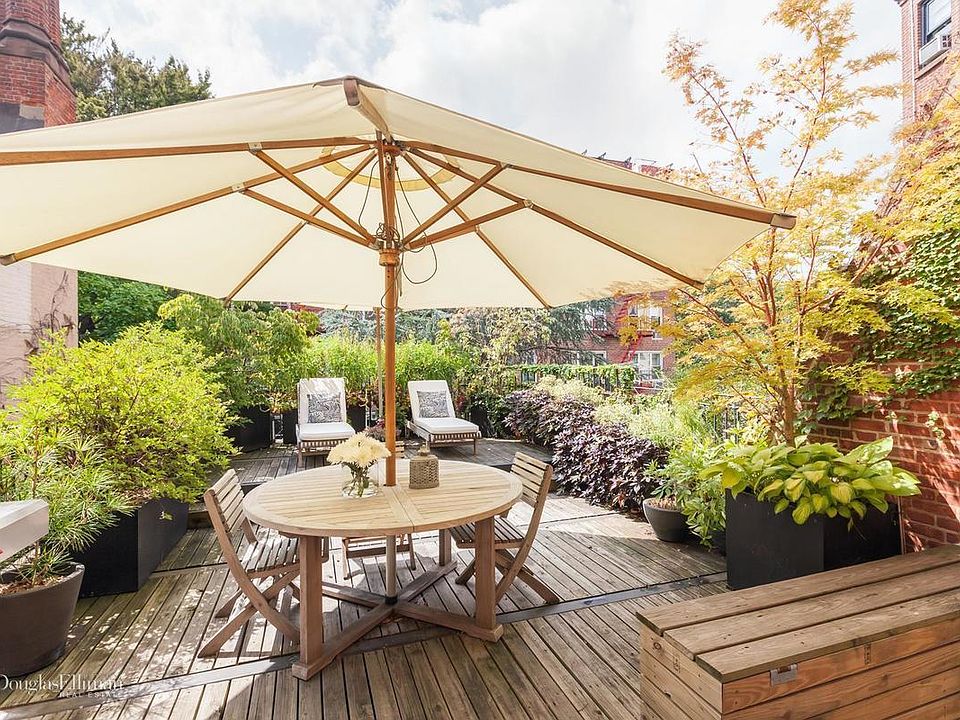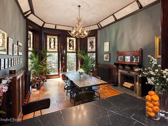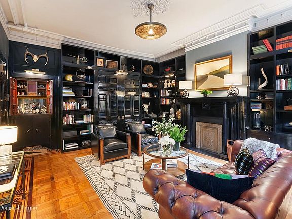 This circa 1844 brownstone duplex is located on one of the most sought after blocks in Brooklyn Heights. Originally a single family home this apartment features what may have been the grandest room of the house, a 15' by 20' great room framed by a 12' coffered ceiling, paneled walls, intricately detailed oak trim, a wood-burning fireplace and a southern wall featuring stained glass windows each depicting one of the four seasons. Beyond the window wall is the first of two planted terraces. At the opposite end of the room a large breakfast bar opens to a modern kitchen that has been designed to blend seamlessly into its old world surroundings. The kitchen features classic 19th century cabinetry, soapstone counters a Liebherr refrigerator, Bertazzoni range and Miele dishwasher. Competing as the main room of the apartment is a large living room featuring a wood-burning fireplace, a full wall of built in cabinetry for storage and display and an antique safe!! This original family safe now opens to reveal a bar that serves as a unique backdrop for any cocktail hour. A full bath with footed tub completes the first floor. At the top of the steps you enter a large master bedroom with a third wood-burning fireplace and en-suite bath. Just off the master bedroom is a multi-level planted terrace that can provide a spot for quiet solitude or easily accommodate a party crowd. All in all a perfect home for anyone who likes to entertain allowing a flow of guests from living room to great room to terraces beyond. Currently configured as a grand one-bedroom this apartment is easily converted to a two bedroom by using the great room as a combination living/dining and turning the current living room into a bedroom. 44 Remsen is an intimate 8 unit coop - mere to the Brooklyn Heights Promenade and Brooklyn Bridge Park!