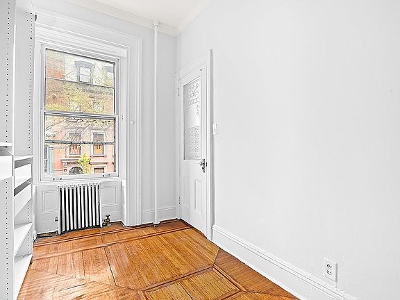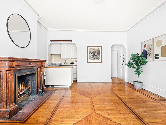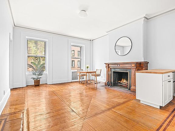 There is a magnificent working wood-burning fireplace surrounded by a decorative oak mantle. The living room is very spacious with very high ceilings and large period windows which face the quiet, tree-lined street. The unit is on the third floor of a walk-up. Freshly painted, there are period details throughout including moldings and the original herringbone parquet floor. The unit is on the third floor of a walk-up.