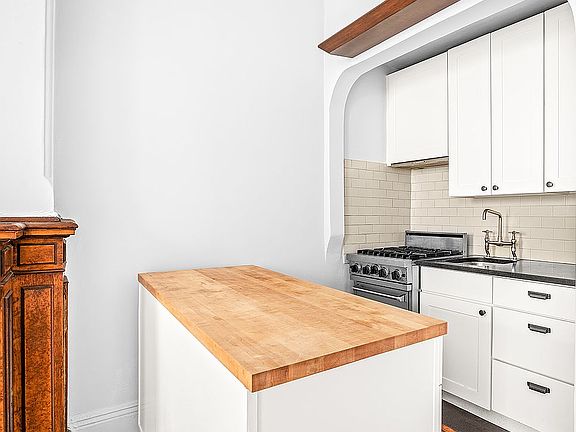 The renovated kitchen is discreetly positioned in the back of the living room, has stainless steel appliances including a Viking range, subway tile, and a butcher-block island. There is storage built into the bedroom, a coat/ linen closet, and a beautifully tiled bathroom.