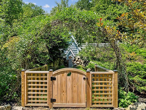 As you approach, be welcomed by whimsical archways of wisteria and climbing roses, along with a miniature bunny house and gate that add a playful touch to the landscape. A tranquil pond shaded by graceful willows sets the tone for relaxation. The private dock provides the ideal spot for kayaking or swimming in the calm waters of Long Cove.