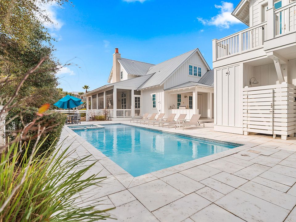This exceptional custom-built 30A residence was thoughtfully designed to deliver a premier coastal living experience. Offered fully furnished, the home presents a compelling investment opportunity with projected annual rental income of approximately $286K. Ideally located just one mile from Alys Beach, the property features a highly desirable floor plan with six bedrooms, three distinct living areas, and multiple outdoor living spaces perfect for entertaining.Designed with both comfort and style in mind, the home boasts a summer kitchen, screened-in porch, carriage house, two-car garage, and an expansive heated pool and spa. The meticulously curated interior showcases a gas fireplace, large transom windows, and elegant window treatments that flood the home with natural light. The chef's kitchen is beautifully appointed with custom inset cabinetry, quartz countertops, and premium Wolf and Sub-Zero appliances. The main living area offers modern furnishings centered around a striking fireplace with a wood mantel. An inviting Southern-style wraparound front porch leads seamlessly to the screened-in porch, creating an ideal setting for relaxed coastal entertaining.