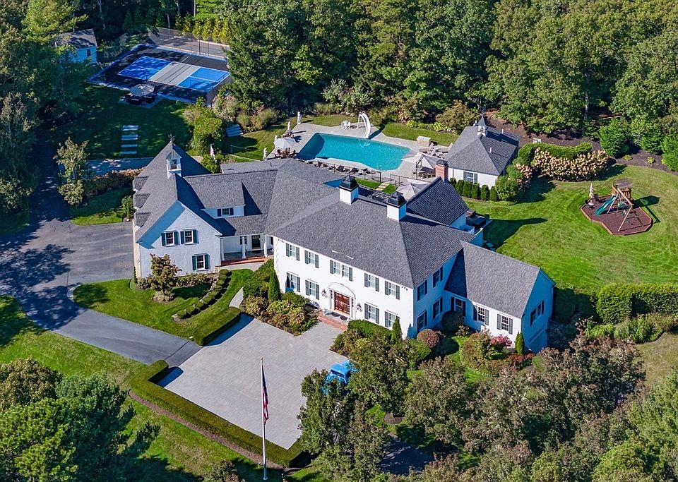 Set on 3.4 acres and bordered by an additional 2.88 acres of protected land, this exceptional estate offers a family retreat unlike any other. Featured in The Wall Street Journal, the home spans over 8,000 square feet of thoughtfully designed living space, with fully updated systems maintained in pristine condition. Outdoor amenities are second to none—enjoy a sparkling pool with a charming two-bedroom, kitchenette-equipped pool house, a premier pickleball court, and a bocce court. Perfect for both quiet moments and large-scale entertaining, the interior boasts 2 elegant living rooms, a welcoming eat-in kitchen, and seamless access to the patio, where a hot tub awaits for year-round relaxation. The main level hosts the luxurious primary suite, a true private retreat. Upstairs, 4 additional bedrooms and a recreation room offer abundant space for family and guests. Whether you prefer peaceful seclusion or vibrant gatherings, this estate delivers.
