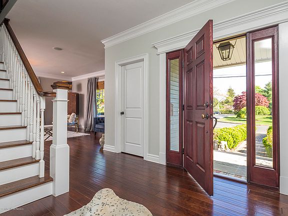 Located on the most family friendly street, this light-filled home was built in 2009 on a large wooded lot. Elegant in its simplicity and generously proportioned, this classic center hall layout lends itself to formal or casual entertaining in rooms that are rich with architectural detailing such as custom dining hutch, built-in's in family room and cabinetry in office. Airy 9' ceilings, dark rich wood floors, designer lighting, beautiful moldings, and refined finishes throughout create an ambience of style and sophistication. Chef's kitchen with professional range, inset white cabinets and spectacular 10 foot carrara marble Island. Peaceful master suite with huge walk-in closet, his and her vanities and jacuzzi tub. Spacious mudroom with dog bath and laundry on both first and second