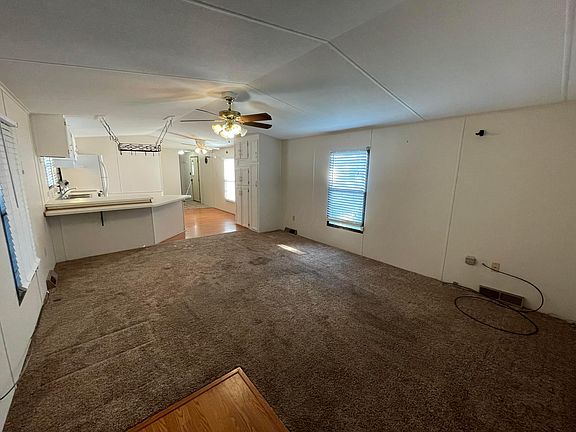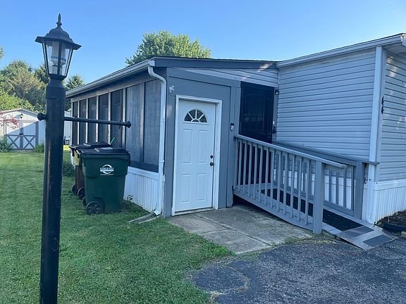 2 bedroom 2 bath home with open family room/kitchen. Plenty of counter space, island and ample cabinets for storage. All appliances will convey with property. Stackable washer/dryer and a few other items will stay as well. Enclosed area currently used for storage, but boards can be removed and opened up. Ramp to front door for better access. Very nice shed will convey. Home is being sold as-is to settle an estate.