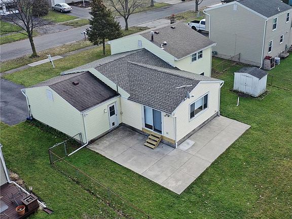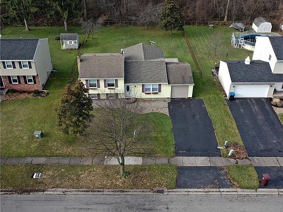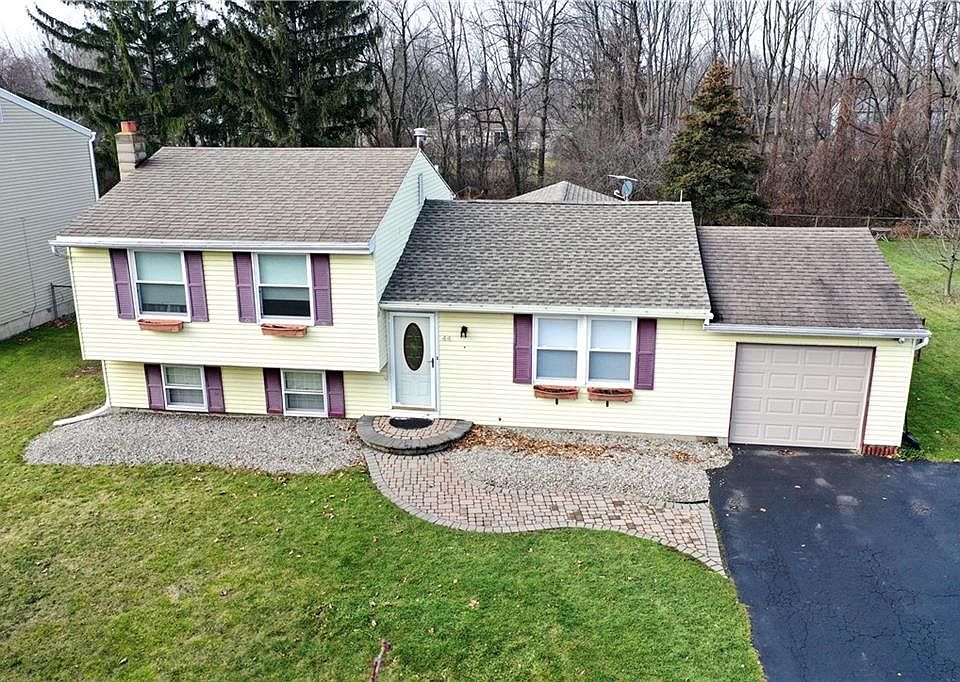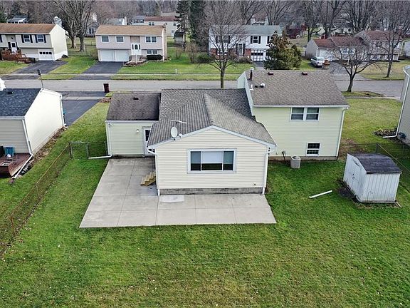 Spacious 3 bedroom Split Level with vinyl siding, one car attached garage, beautiful fenced-in back yard, and huge great room addition with cathedral ceiling - this home is larger than it appears! The open floor plan and entry level eat-in kitchen/great room will impress you the minute you walk in! With large windows and a sliding glass door that leads to the backyard and patio - you will love the natural light all year long. Updated full bathroom has beautiful tiled floor and ceramic tile surround. The lower level family room has a huge half bathroom with enormous storage closet and plenty of room to add a second shower. More storage is available in the basement too! Must see all this home has to offer! SONYMA $20k improvement grant available for qualified buyers and Spencerport Schools!