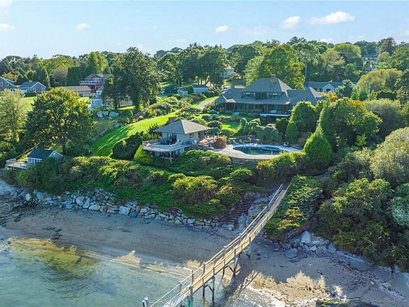 Beyond the gates of this Plum Beach home, exceptional craftsmanship and expansive views await. The elegant Nantucket-style exterior design is at once classic and modern, with 4,496 square feet of living space tucked into an incomparable setting. The sweeping lawn, and the swimming pool and jacuzzi overlooking Narragansett Bay and the Jamestown Bridge invite you to enjoy the natural beauty all around, while the deep water dock and mooring offer opportunities for exploration of the coastline beyond. Inside, attention to detail is everywhere, from the dramatic curved staircase in the entry foyer to the coffered 12-foot ceilings, crown molding, built-in bookcases, and custom woodwork. The gourmet chef’s kitchen is an entertainer’s delight, with Subzero and Bosch appliances and two large islands. The generously-sized living and dining rooms feature a two-sided fireplace. Escape to the first floor primary suite, where vaulted ceilings, marble bath with a jetted tub and separate shower, and two walk-in closets with custom wardrobe elevate the experience of daily living. Upstairs, 3 bedrooms, a bathroom and a spacious media room with wet bar and separate staircase offer space for family or guests. Nearly every window offers water views, and all doors on the first floor open onto the covered bluestone porch. The guest/pool house with two bathrooms, and beach just steps beyond make this a truly special home for memorable summer vacations or gracious year-round living.