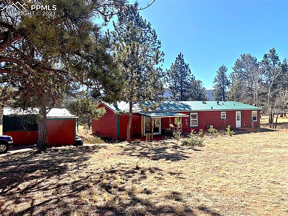 Cozy, comfortable & convenient 3 br Rancher on wooded 2.5 Acre lot. This cozy log sided cabin has 3 comfortable bedrooms with a spacious Master, en suite 5 piece master bath, with spectacular views towards Dome Rock State Wildlife area. There are two decks to enjoy here, East & West! The kitchen is spacious, with a pantry and ample room for cooks to gather and create culinary masterpieces with a gas top range and newer stainless double door fridge. The floors are clean wood laminate in the Family, Dining & Living rooms, with carpet in the bedrooms and easy to clean vinyl tile in the bathrooms and kitchen & laundry areas. There are two fireplaces, one a cozy wood stove the other masonry, great for family gatherings and keeping the chill off on a stormy night. The 3 sheds included are great for storing your toys & tools, one could be a studio or workshop. This home is located conveniently close to Cripple Creek, Florissant & Divide, with an easy drive to Canon City and Colorado Springs, an easier drive to the Ski areas along back country roads and low traffic heading into the wild blue yonder. The Florissant fossil beds are down the road, Pike National Forest is close, Mueller State Park is just around the corner for hiking & exploring, several great fishing holes are nearby...but you could just sit on your own deck and watch the abundant wildlife pass through to the peaceful Wildlife areas and beyond.