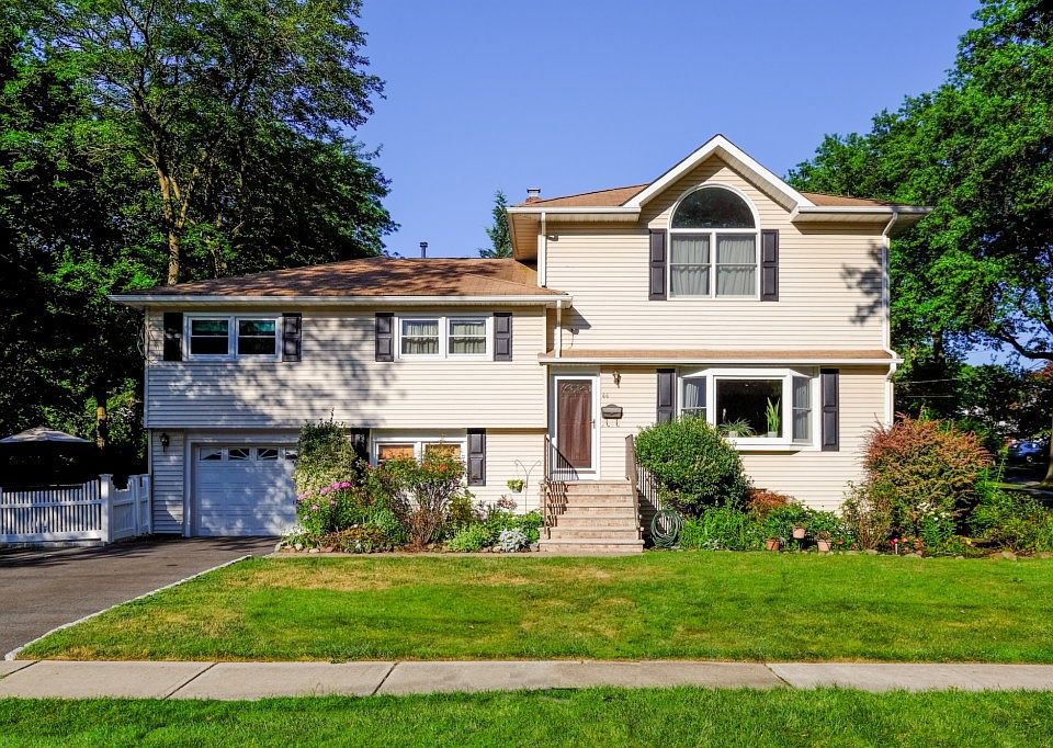 Welcome to this expanded split level with dramatic master bedroom suite. The location of this home is ideal - close to schools, parks and train station. Step inside the entry foyer which opens to living room with large bay window and fireplace with beautiful stone hearth. The dining room is large enough to comfortably seat six. An attractive kitchen has ample storage, newer stainless appliances and updated flooring. Half a level down are family room, laundry room with half bath, garage access and door to yard. Up a few steps are three bedrooms with hardwood floors and a large hall bath with tub. At the top is an unbelievable master suite with cathedral ceiling, palladium window, two walk-in closets, full master bath and extra room for home office/gym. The basement could be finished for even more living space. Outdoors is a fenced side yard with large patio and separate fire pit area. This attractive home is a bargain for buyers looking for the perfect location to call home.