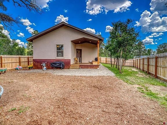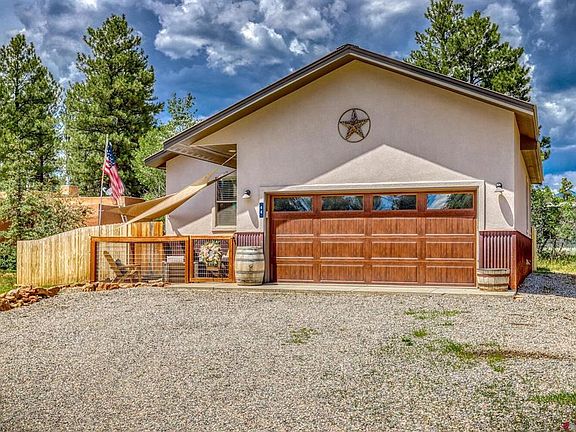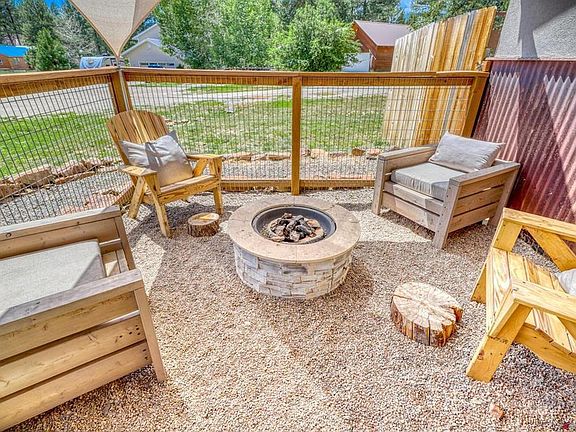 LOOKING FOR A EASY KEEPER IN PAGOSA SPRINGS, CO.? This upgraded single level ranch style home is sitting on .29 acres on a quite cul-de-sac backing to green belt, this 3 bedroom, 2 bath, 2 car garage, home has a open floor plan with 9' walls and vaulted ceilings, hand cut granite counter tops throughout, soft close hickory cabinets throughout, under mount kitchen sink, stainless gas cooking stove and oven, stainless side by side refrigerator and dishwasher, pantry, plenty of light and windows in every room, A/C, natural gas tankless water heater, bronze fixtures both plumbing and electrical throughout, knotty alder doors and trim throughout, primary bedroom with on suite custom tiled bathroom with walk in shower and glass shower door, walk in closet, all 3 bedrooms have walk in closets, covered redwood front and rear porches with fire pit and sitting areas, large fenced back yard with extra side garden or play area and partially fenced front yard, hand stacked stone fireplace surround with natural gas fireplace with blower to keep you super cozy and warm in the winter and it gives it that real Colorado feel, included in the sale is a mounted 50" flat screen TV and partially furnished. The native Colorado Ponderosa Pines and Gamble Oaks are a real plus and provide good shade. Located in the Pagosa Lakes area with public water, sewer natural gas and for a nominal annual fee of $275, members enjoy year round access to a multi-million dollar recreation center with large indoor saltwater pool, fishing and boating rights to any of the association’s private stocked fishing lakes and access to several National Forest trailhead parking areas. (affordable fees for these amenities to apply) Designated RV gravel parking area. LOCATED 2 MIN. FROM THE PAGOSA SPRINGS GOLF COURSE.