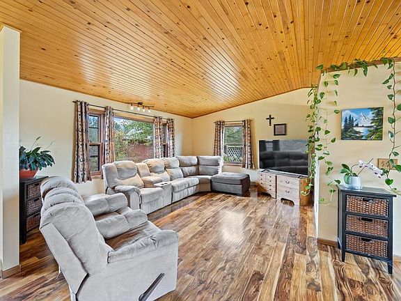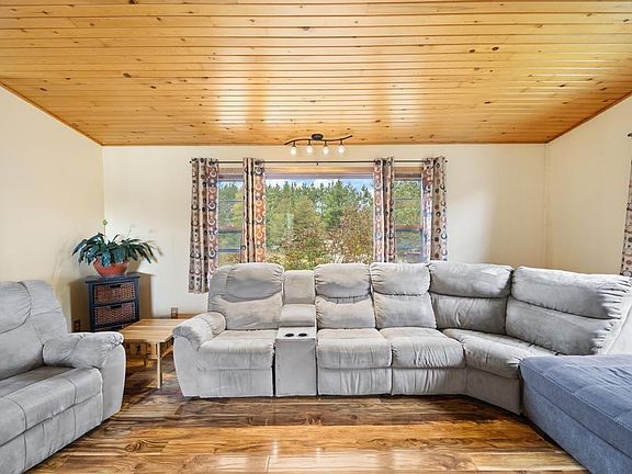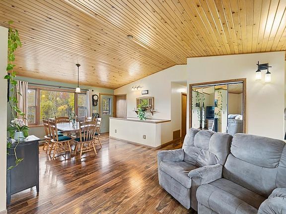 Room to play on 8.05 acres with trails for exploring! Open floor plan with cathedral ceilings, wood floors, and great spaces for entertaining. Expandable dining area and snack bar. Master bedroom with walk-thru full bath and door to the hot tub room. Two more main floor bedrooms and a large hot tub room. Basement has a family room with gas fireplace, area ready for a sauna, laundry, bedroom/den, and 3/4 bath. Huge 56x28 garage ready for your toys! Electric: $364/mo average
