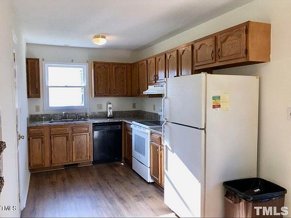 Charming 3-bedroom home located in a peaceful cul-de-sac. The spacious living room features built-in bookshelves, storage cabinets and a convenient half bath. The kitchen has natural stained oak cabinets, granite countertops, and a smooth top range. The home has carpet throughout and updated granite countertops in the bathrooms. The .35-acre lot is beautifully landscaped with Bradford pear trees in the front and a private backyard, perfect for relaxing.Located close to shopping, restaurants, and providing a quick commute to Raleigh, this home also boasts a charming covered porch and a storage room in the back, adding to its appeal. It's a delightful place that combines convenience and comfort!