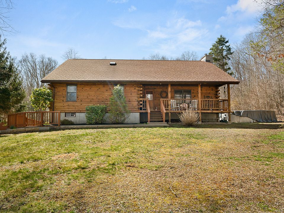 *** Calling for highest and best offers to be submitted by Tuesday, April 2, 2024, at 3pm. *** Located on over 7 acres, this well-maintained recently updated custom log home features three bedrooms, two full bathrooms, an oversized garage, workshop/storage space, and recreational vehicle/toy parking and storage. Perfectly blending rustic New England charm with modern conveniences and upgrades throughout. The home's custom floorplan is ideal for single-level living with two bedrooms on the main level along with a full bathroom, living-room with vaulted ceilings, kitchen with hardwood cabinets and quartz counters, and dedicated laundry space. The vaulted ceilings and Vermont Castings woodstove in the living-room and open layout 'cook's kitchen' incorporate modern conveniences with rustic elegance. The upper level hosts a private master bedroom suite with full bathroom (with radiant floor heating), sitting area, cedar closets and storage space, vaulted skylights, and a private separate entrance. The lower level includes a walkout basement, oversized 1-car garage, workshop/storage space, and a 50-amp Recreational Vehicle (RV) hookup. The professionally maintained yard is picture-worthy year-round. An outdoor enthusiast's paradise, the property includes wooded trails with local wildlife and birds, dedicated garden/landscaping designs, and an above-ground pool. Looking for your next home or a weekend getaway - don't miss out on this gem! Located in the town of Bozrah, New