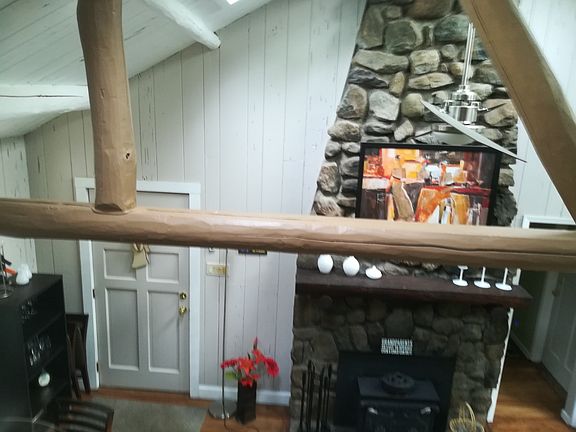 Log-supported roof with 6 skylights. New bathroom and kitchen. Double paned windows throughout. Central heat and air conditioning. Newly refinished hardwood floors and new paint. Loft can be used as a bedroom. Stone fireplace with insert. Cedar siding.