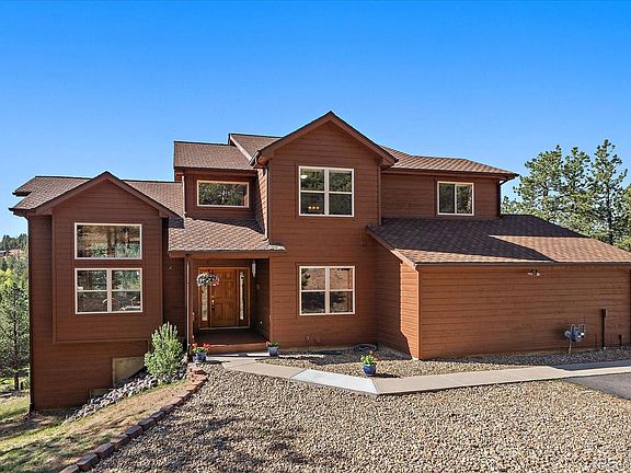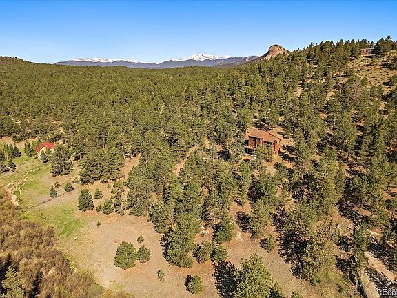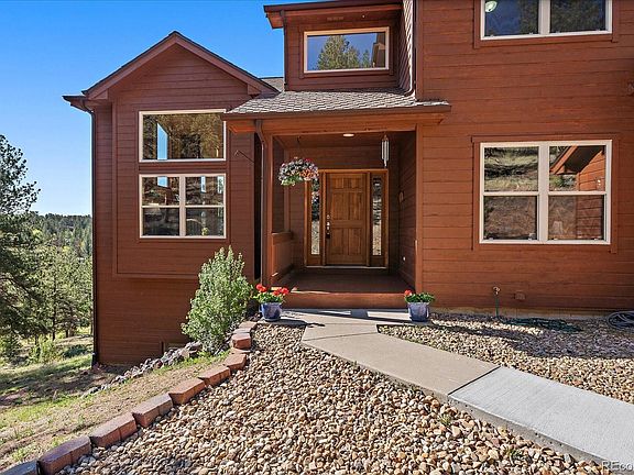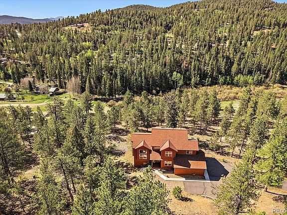 Welcome to your charming retreat nestled in the woods. This picturesque property offers a unique opportunity to embrace the Colorado lifestyle featuring far reaching majestic views and serene meadow with a tranquil stream. Step inside this inviting home and discover an open floor plan, accentuated by a giant wall of windows and vaulted ceilings that create a sense of spaciousness and airiness. The main level features a bright inviting living area, a thoughtfully designed kitchen, all which seamlessly flow into the dining space with glass slider doors to walk out to the large deck, ideal for entertaining. The main floor also features a half bath and a convenient home office with French doors and built-in bookshelves, offering a perfect space for productivity. Venture upstairs to a landing with room for a desk or reading nook inviting you to the primary bedroom, plus two additional bedrooms and a remodeled full bathroom down the hall. The primary bedroom boasts a prominent bay window, vaulted beetle-kill pine ceiling and a walk-in closet for all your belongings bring peace and functionality to your daily routine. The 5-piece en-suite bathroom, with stylish stand-alone tub, offers a peaceful retreat at the end of the day. Continue down to the lower level, which doesn’t feel like it with 10’ ceilings to a bonus room for possibly a workout, or billiards and a movie night next to your cozy gas stove. End your day with a soothing soak in the hot tub right out the glass slider doors, surrounded by the tranquility of nature. A fourth bedroom and a 3/4 bath on this lower level is perfect for guests or hobbies. Ample storage spaces, including built-in shelves in the hall, large storage room and utility room ensure that all your belongings are neatly organized. The property spans over 5 acres, providing plenty of room for outdoor activities and relaxation. Immaculately maintained by the original owners! More than a home; it's a lifestyle waiting to be embraced.