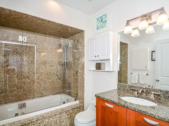 Renovated 2 bed 1 full bathroom apartment on the Waterfront. Custom kitchen w/ stainless steel appliances and granite counter tops. Large living room . Large designer bathrooms w/ fully tiled walk in showers, glass door and custom vanities. Other features include hardwood floors and recessed lighting throughout, central AC. Designated Parking garage. Available 06/01