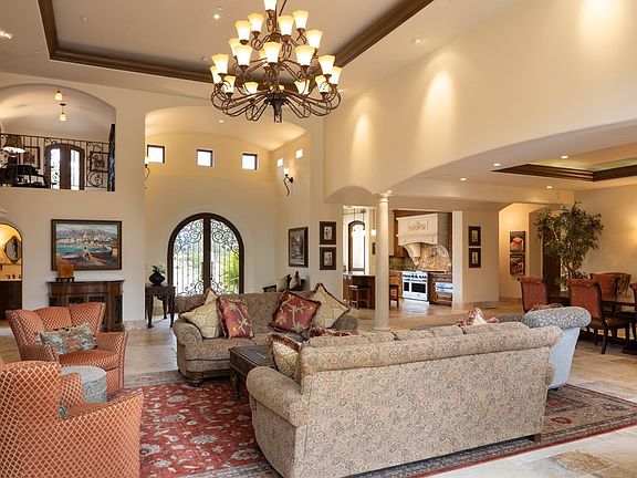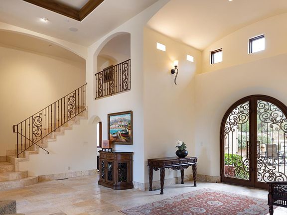 Flat, private and gated half-acre lot with a beautiful, single level home featuring high ceilings, open floor plan, light and bright with a huge kitchen, over-sized dining room and living room with 16 fireplace; master suite with spa-like bath; movie theater for 10+; gym; library; all en-suite bedrooms. Every room has outdoor access to take advantage of the patios, balconies and beautifully appointed yard. In addition there is a circle drive and a 3 car garage. All of this and only a few blocks to the ocean!