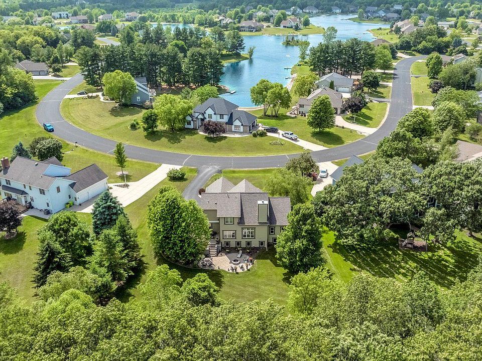 The Pines! Swim, fish or relax by the clean, spring-fed lake. Gorgeous, lovingly maintained, 4 BR, 3.5 BA property with the most lavish back yard. Huge lower patio overlooks private tree-lined backdrop & nature preserve beyond owned land. Quality built with touches of rustic charm throughout. Inviting front entry. Spacious LR with vaulted ceilings, floor to ceiling stone FP, maple HWFs connect most rooms on main, lovely cedar accent opening to dinette. KIT features maple custom mill made cabinetry, Corian counters, granite top on island, planning desk & walk-in pantry. Formal DR or use as office. Main floor primary suite, vaulted ceilings, large BA, double sinks, glass door & tile surround shower with separate soaking tub & huge WIC. Many updates! Close to I94, shopping & healthcare.