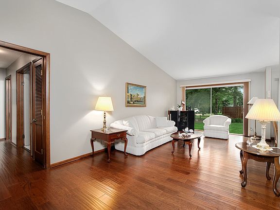 Welcome to this spacious and beautifully maintained 3 bedroom, 2.5 bath step ranch with a finished basement and attached 2-car garage! Step into the vaulted entryway with ceramic tile flooring, leading to an open living room, dining room, and hallway featuring rich scraped wood laminate floors. The bright eat-in kitchen is a chef's dream with ample windows, maple cabinetry, Corian countertops, double oven, cooktop, microwave, dishwasher, and refrigerator. The vaulted family room is warm and inviting with a gas log fireplace-perfect for cozy evenings. The primary suite includes a charming bay window, a full wall of closets, a separate changing area, and a private bath with a walk-in shower. The second and third bedrooms offer generous closets and share a full hallway bath with tub. Convenient main floor laundry includes washer, dryer, utility sink, and extra cabinetry, plus a powder room just off the family room. Downstairs, the finished basement features a large rec room with built-in shelving, cabinets, a wet bar, and access to a large crawl space. You'll also find a dedicated storage room with built-in shelves. Step outside to enjoy the private patio-ideal for summer grilling-and a spacious backyard with a handy storage shed. Fantastic location close to schools, parks, train, shopping, dining and more!