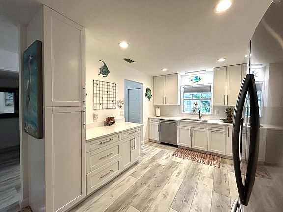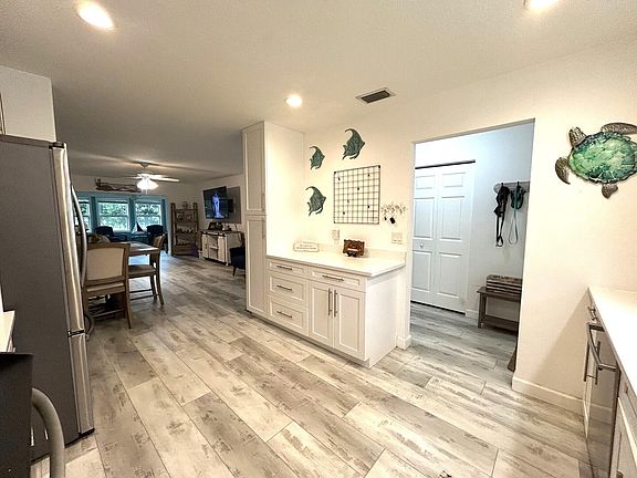 Welcome to your Florida Oasis. Beautifully renovated Villa featuring an open air patio for BBQing or relaxing and enjoying the Florida weather. Renovated kitchen with solid wood white shaker cabinets, Quartz counter tops and stainless steel appliances. LVP flooring through out the property. A/C, electric panel and windows installed in 2021. Extended living area gives room for an office or sitting room. Master bedroom offers ensuite bathroom with walk in shower. Front load washer and dryer. Attic access for storage as well as a storage closet in the Florida room. Community is active with tennis/pickleball, clubhouse, fitness center, 2 heated pools on the lake, billiards and auditorium for parties and entertainment. 10 miles to the beach. Close to shopping, banks and medical.