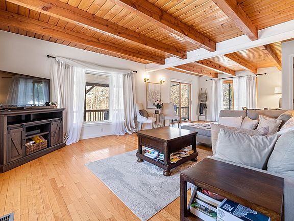 Three bedroom, 3 1/2 bath gambrel-style home with over 2,000 square feet of living space. First floor features exposed beams, hardwood floors, spacious kitchen, dining and living rooms with a nice open floor plan for entertaining as well as a full bath with laundry. The second floor master suite includes a walk-in closet and 3/4 bath. Full, unfinished, walkout basement with pellet stove. Four garage bays for vehicles as well as storage. Plenty of space to enjoy the well landscaped yard from one of the two large decks or two covered porches. Sited on a 1.0 +/- acre open lot with apple trees and blueberry bushes. Close to Hartford Town Forest for recreational activities. Open House Sat 2/24/24 - 11 am to 1 pm.