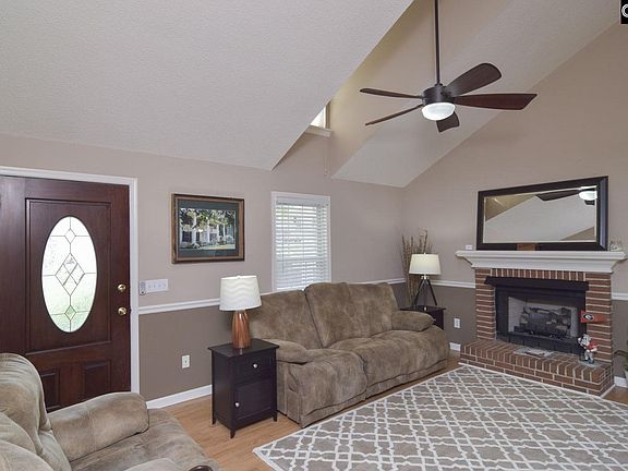 - Living Room: Fireplace, Ceiling-Vaulted, Floors-Laminate, Ceiling Fan