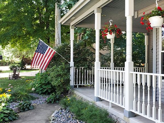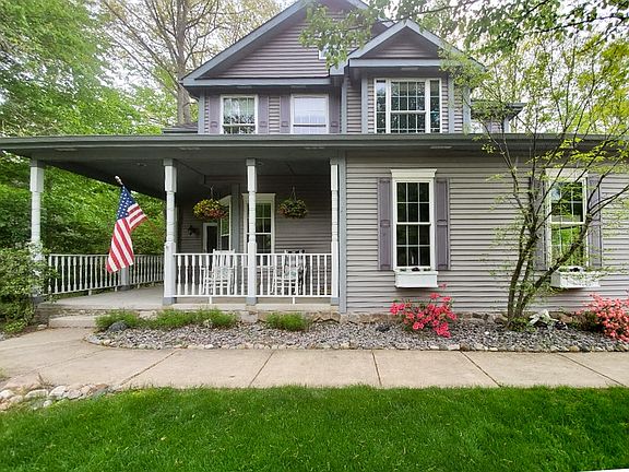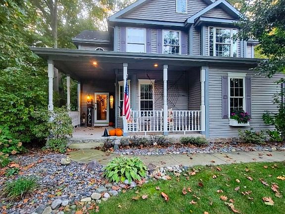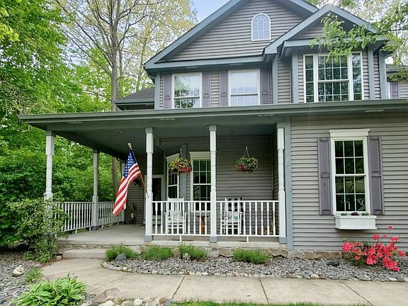 Welcome to this charming victorian style home nestled on a serene wooded lot in prime Chesterton locale! This 4 bedroom, 3.5 bath two-story presents an abundance of spacious character! A welcoming greeting is given by gorgeous landscaping w/ a picturesque wrap around front porch. Beautiful hardwoods flow throughout the main floor, which presents a formal dining, flex room (perfect office, den or play room) & half bath. The well appointed open-kitchen design is further highlighted by hardwood floors, stainless appliances and rich cabinetry. A striking stone fireplace in the adjoining living room is perfect for cozy winter nights. The upstairs is comprised of a large primary bedroom showcasing a beautiful en-suite, 3 more dreamy bedrooms and another adorably updated full bath. The finished basement is sure to be to perfect place to entertain w/ a fabulous wet bar, rec room and another half bath. Enjoy morning coffee or evening wind-downs in a fantastic 3 seasons room overlooking the scenic wooded backyard. This friendly, light-filled gem is perfect for entertaining and additional amenities include quick access to beaches, highways, and the highly desirable Duneland school district. This well nurtured home has recent updates including a newer furnace, water heater (2019),2015 AC w/ new condenser fan (2021), attic re-insulated (2020), gutter guards (2024), new garage door and new dishwasher.