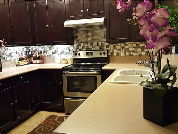 Ground level park-like unit w/9ft ceiling & fans. Big window looks out into back yard, allowing lots of sunlight. All rooms are spacious. Master bedroom has sliding door to outside patio into back yard. Open kitchen with stainless steel appliances & breakfast bar overlooks eating area which flows into family room with wood mantel fireplace and gated door to patio into backyard & outdoor storage closet. Quiet & gated community, close to town center & shops & mins. to freeway access.